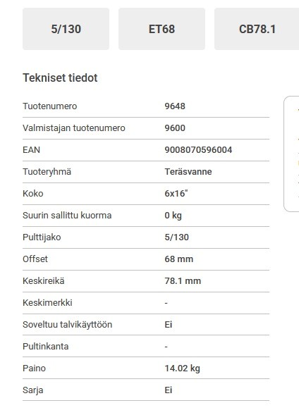 9646 7011 TERÄSVANNE 6X16 5/130 ET68 CB78,1